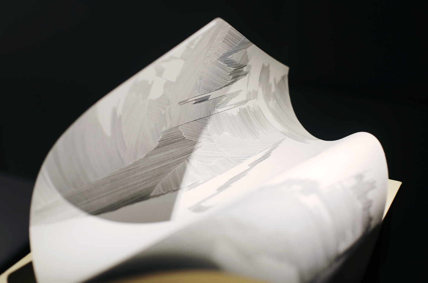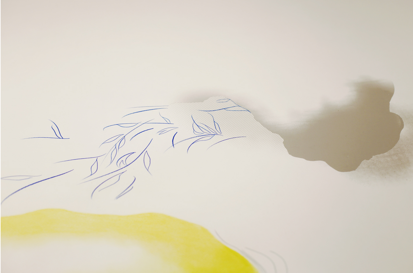 The presentation device, designed and conceived in collaboration with the designer Pierre Bourré, tells as much as the drawing; each event is discovered at a different height and horizontality. An excerpt from the traveler's logbook, printed in large format, faces all the stages and gives voice to the narrator of the expedition.