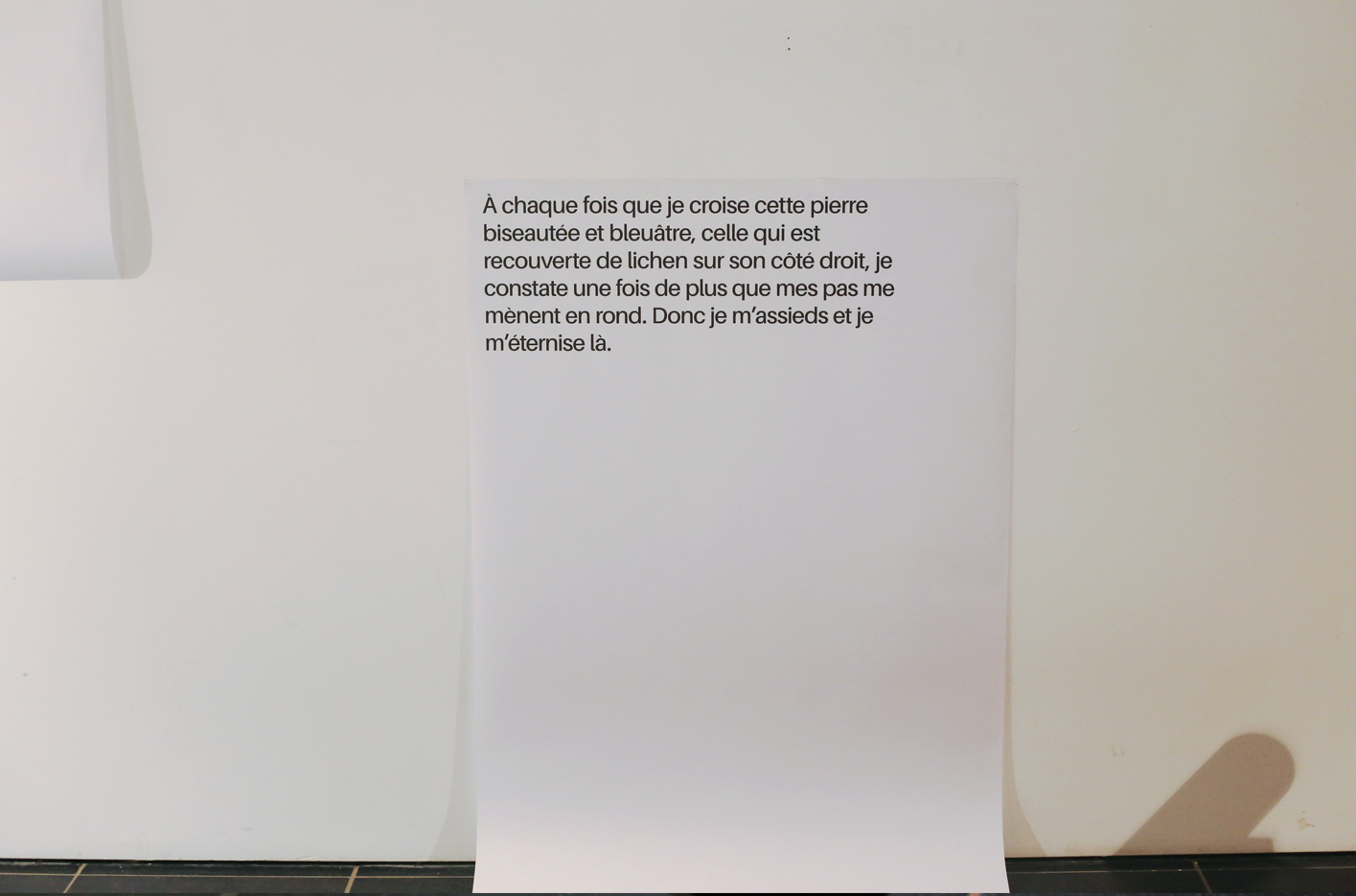 Le silence des construits is an installation created in 2017 in the Galeries de la Reine in Brussels. It’s an improvisation based on the writing of geography in order to include on the map the data that is usually denied to it, to include the path followed but also and above all the rest: what the walker harvests there, the wound that will make him slow down, the wheat fields he crosses, what he thinks about it, how he lives there. It’s the story of a journey whose four main stages follow each other in space: the routine, the accident, the rest and then the meeting.